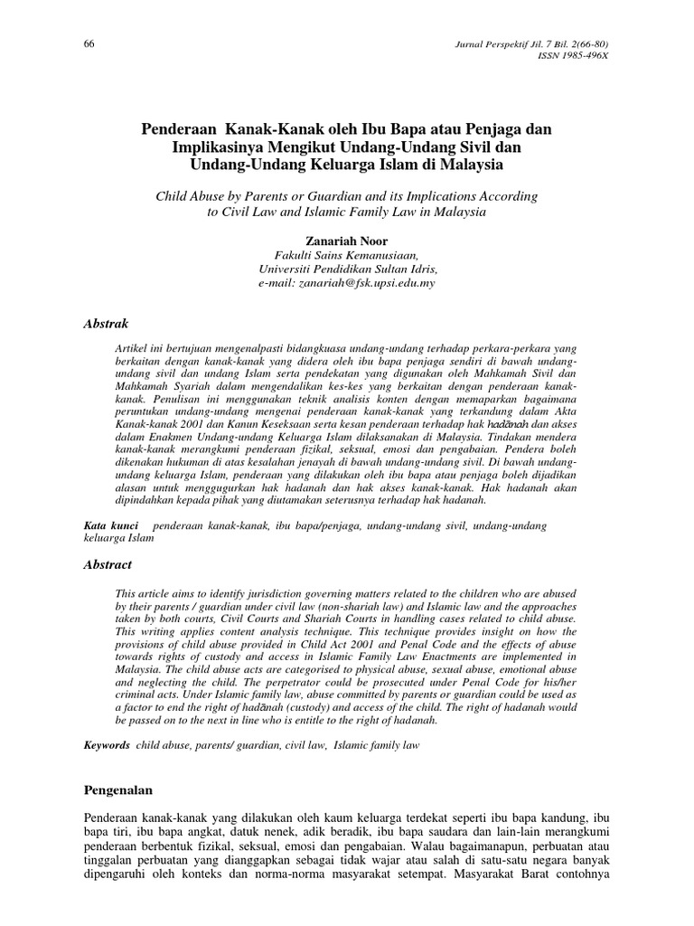 SATU ANALISIS Norsaleha Mohd Salleh1 Noor Hafizah Mohd Haridi1 Zetty Nurzuliana Rashed2 Kamal Azmi Abd Rahman1 Norbahiah Misran3 Nabilah Huda Zaim1 1 Fakulti Pengajian Peradaban Islam Kolej Universiti Islam Antarabangsa Selangor 2 Fakulti Pendidikan Kolej Universiti Islam Antarabangsa Selangor 3 Fakulti Kejuruteraan dan Alam Bina. Sebagai contoh di Malaysia sendiri tidak terdapat data yang lengkap mengenai kejadian penderaan atau pengabaian warga tua. Melalui kajian inijuga penyelidik dapat melihat reaksi dan mendalami emosi kanakkanak yang didera.