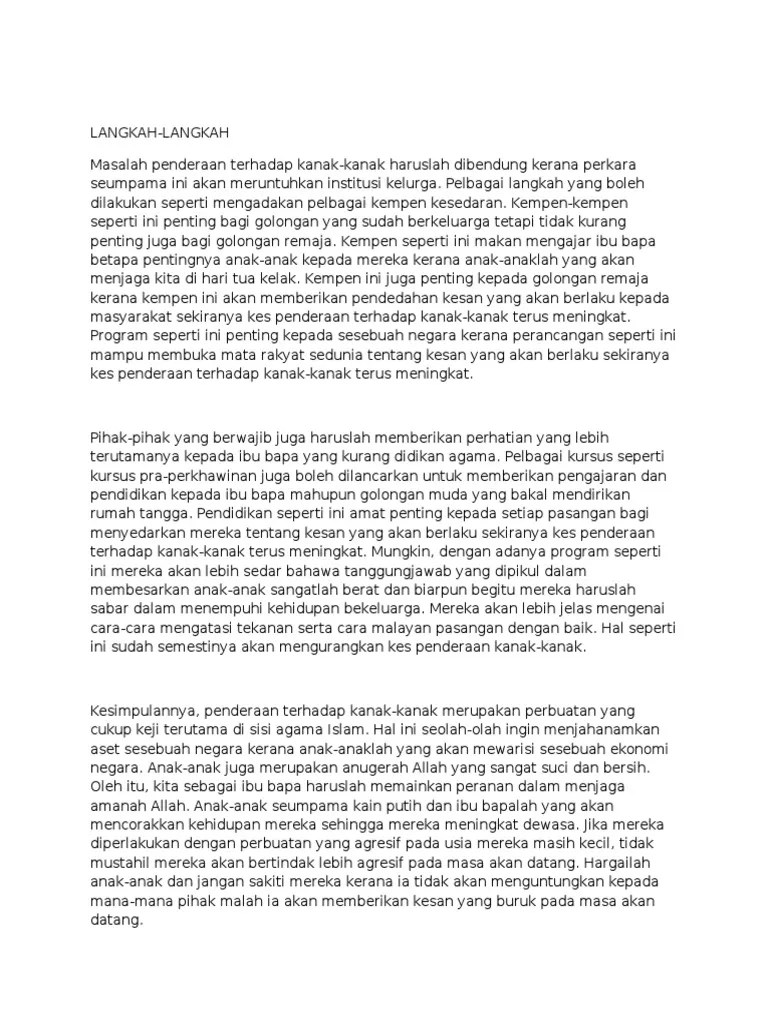 KARANGAN SPM - Langkah-Langkah Mengatasi Masalah Penderaan Kanak-Kanak Dan Masalah Pembuangan Bayi. Penddi k bi oleh menaj dkian drii mereka perihatin terhadap petanda penderaan dan prosedur membuat laporan. Dalam usaha membanteras kes penderaan kanak-kanak daripada berlakuperanan masyarakat haruslah diutamakan.