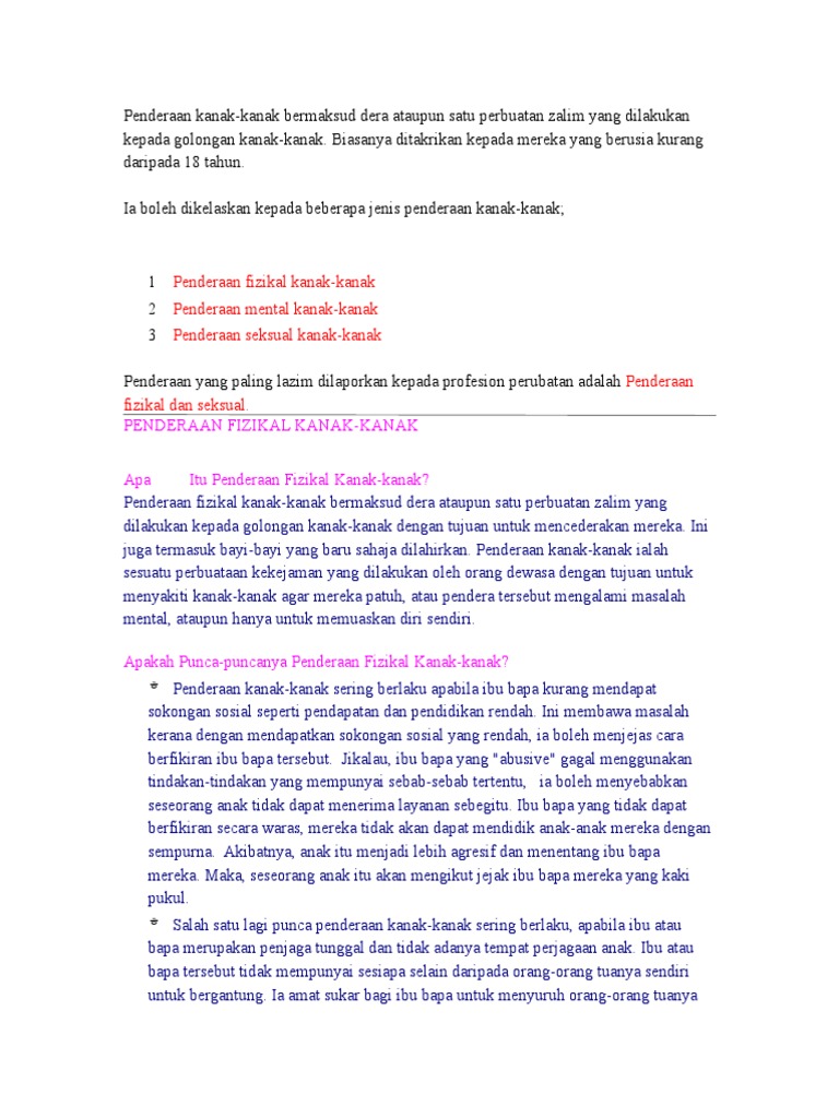 Add to my workbooks 0 Download file pdf Embed in my website or blog Add to Google Classroom Add to Microsoft Teams Share through Whatsapp. Penderaan Kanak-Kanak Chng Woon Kee. 1Penderaan fizikal kanak-kanak Penderaan kanak-kanak secara fizikal merupakan sesuatu yang kejam yang dilakukan oleh seseorang dewasa dengan tujuan menyakiti kanak-kanak agar kanak-kanak tersebut patuh atau pendera tersebut mengalami masalah mental ataupun disebabkan bagi memuaskan diri mereka secara psikologi.