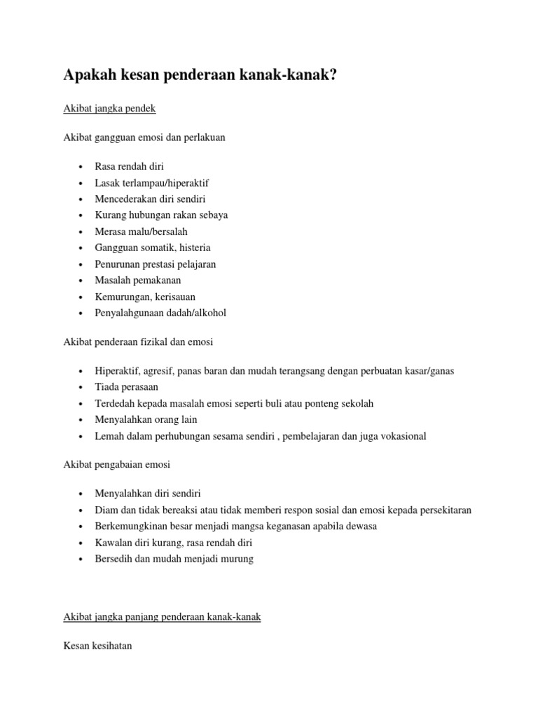 Penderaan Fizikal Terhadap Kanak-Kanak - Mana-mana kanak-kanak yang mempunyai kesan lebam luka lecur atau retakan tanpa penjelasan yang munasabah mungkin sedang mengalami penderaan fizikal terutama apabila terdapat beberapa kecederaan yang berulang. Bagi kanak-kanak yang sering mengalami bengkak selepas terhantuk doktor biasanya akan membuat pemeriksaan bagi mengesan masalah pembekuan darah jika mereka tidak mempunyai rekod penderaan fizikal. Penderaan kanak kanak titas docx 1 0 pengenalan penderaan merujuk kepada penderaan secara fizikal dan mental terhadap manusia penderaan kanak kanak course hero You have just read the article entitled kesan kes penderaan kepada mangsa dan keluarga.