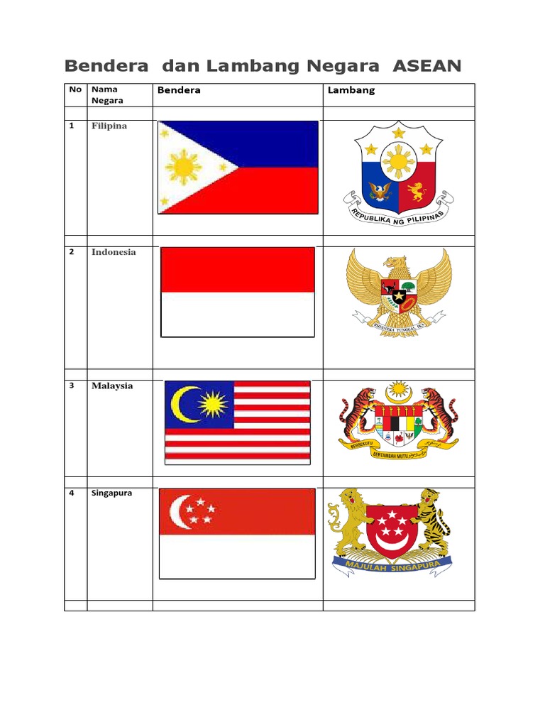 Dimana didalamnya akan membahas mengenai disebutkan 10 negara asean beserta keterangannya. Bendera 11 negara asean dan lambangnya. Singapura Bendera Negara Singapura tidak memiki sebutan bendera negara tersebut hanya dikenal dengan nama Bendera Singapura.